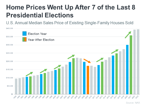 Home prices are remarkably resilient, usually rising year-over-year, regardless of elections. NAR data shows that after seven of the last eight Presidential elections, home prices increased the following year. The one exception was during the housing market crash, which was far from a typical year.